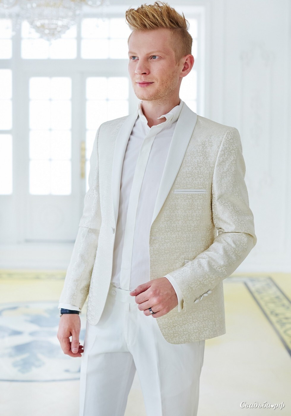 Смокинг-двойка оттенка айвори, выполненный из расписного жаккарда и лёгкие брюки в тон.
