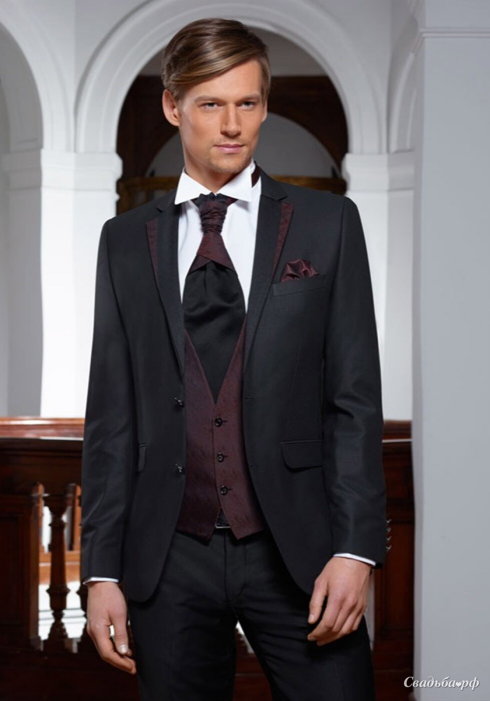 Приталенный мужской костюм на одной пуговице. В комплект входит Пиджак, брюки, жилет, пластрон, брошка для пластрона.