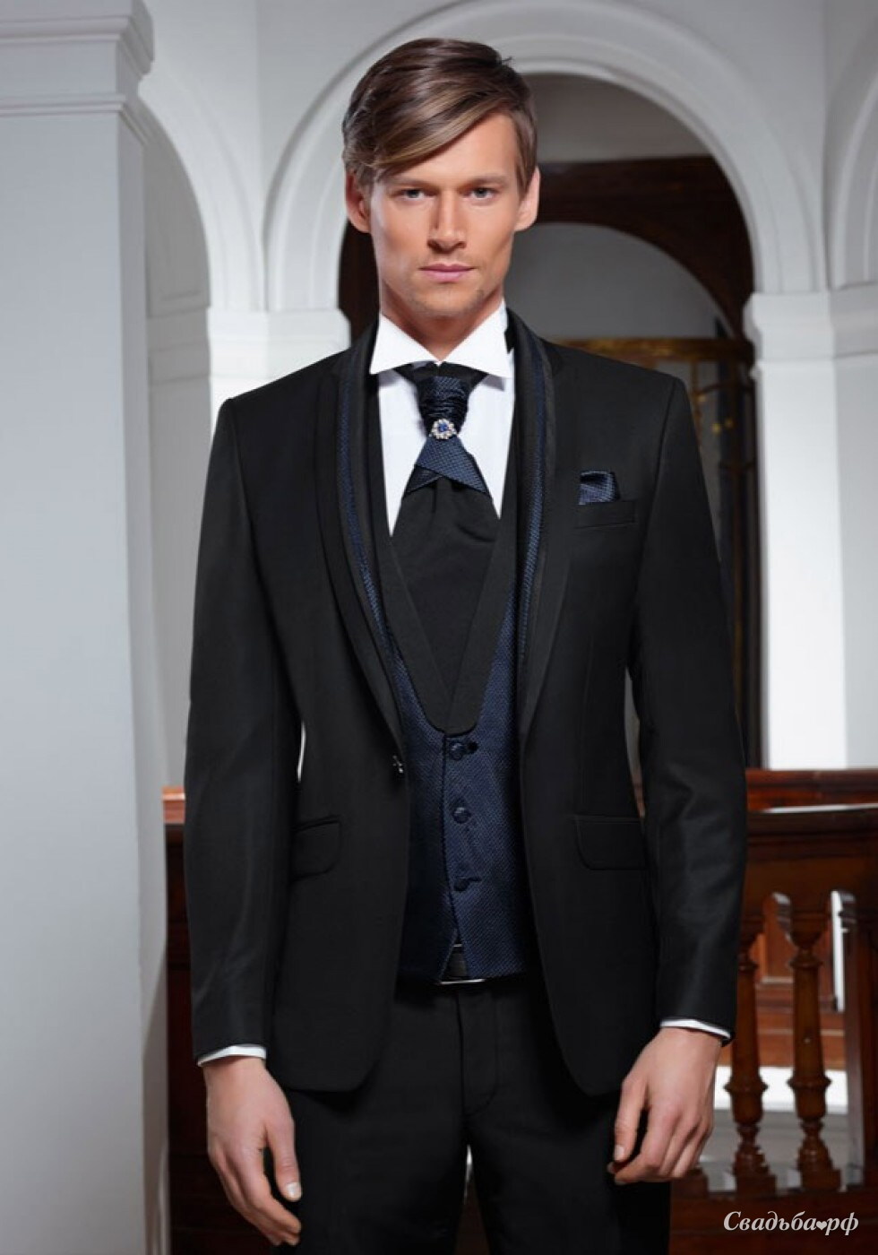 Приталенный мужской костюм, зауженные брюки. В комплект входит Пиджак, брюки, жилет, пластрон, брошка для пластрона.