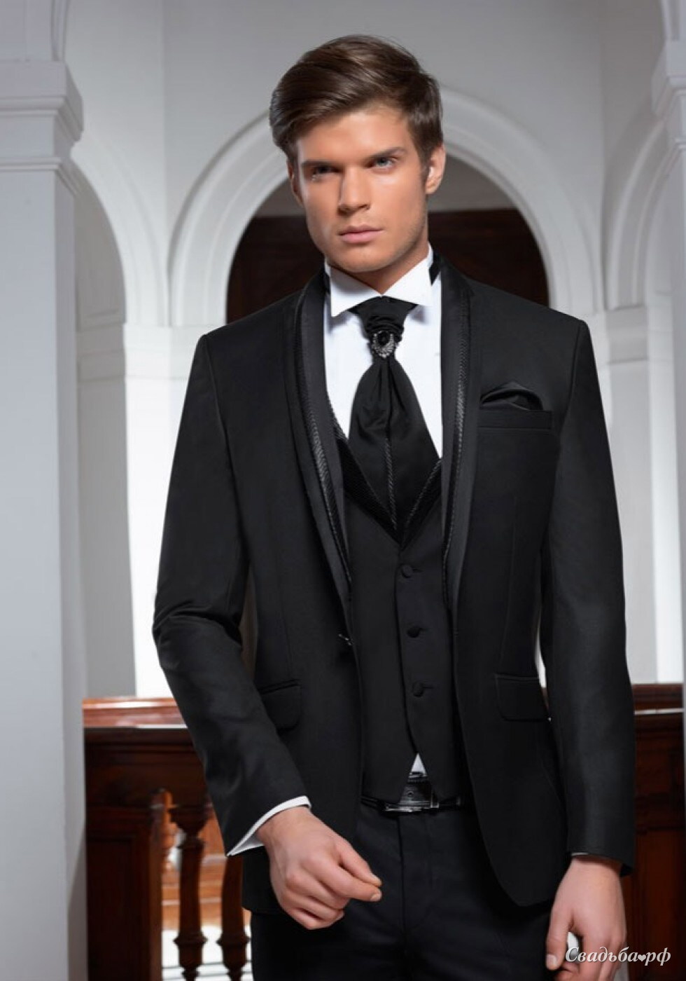 Приталенный мужской костюм, зауженные брюки. В комплект входит Пиджак, брюки, жилет, пластрон, брошка для пластрона.