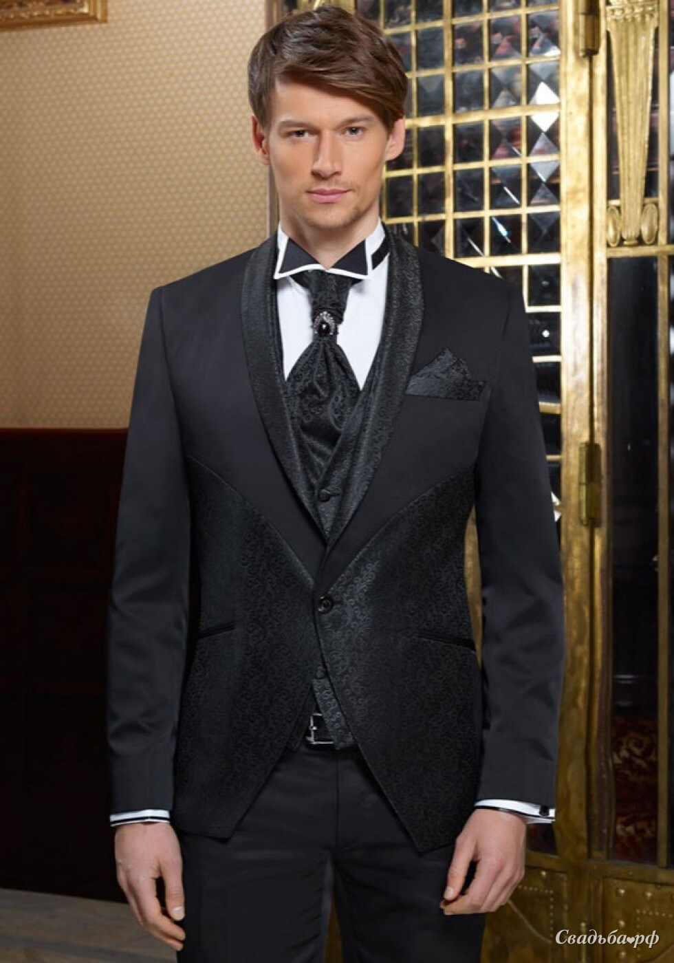 Приталенный молодежный мужской костюм, зауженные брюки. В комплект входит Пиджак, брюки, жилет, пластрон, брошка для пластрона.
