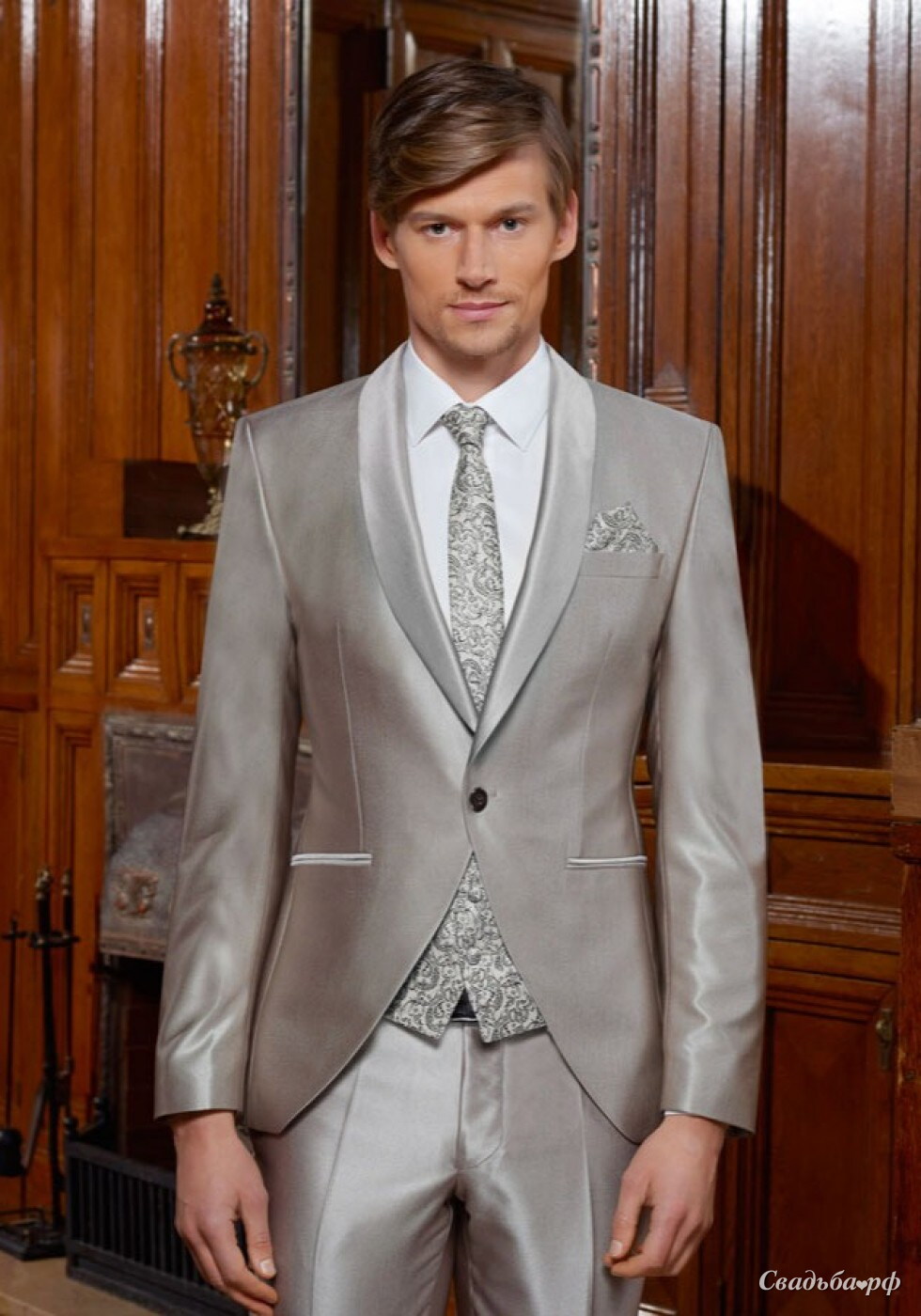 Приталенный молодежный мужской костюм, зауженные брюки. В комплект входит Пиджак, брюки, жилет, пластрон, брошка для пластрона.