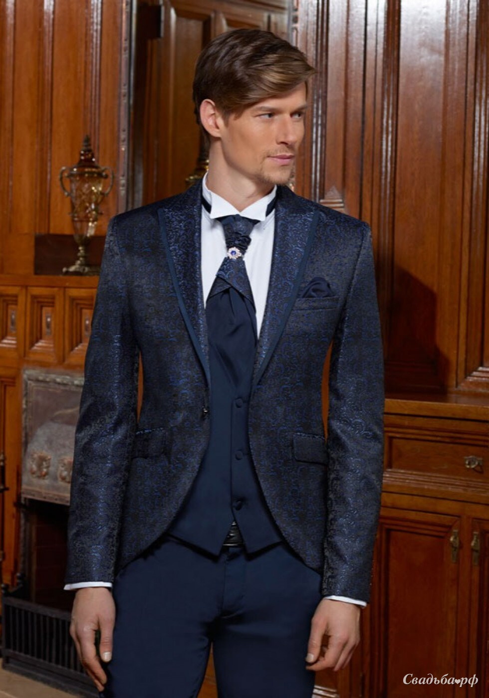 Приталенный молодежный мужской костюм, зауженные брюки. В комплект входит Пиджак, брюки, жилет, пластрон, брошка для пластрона.