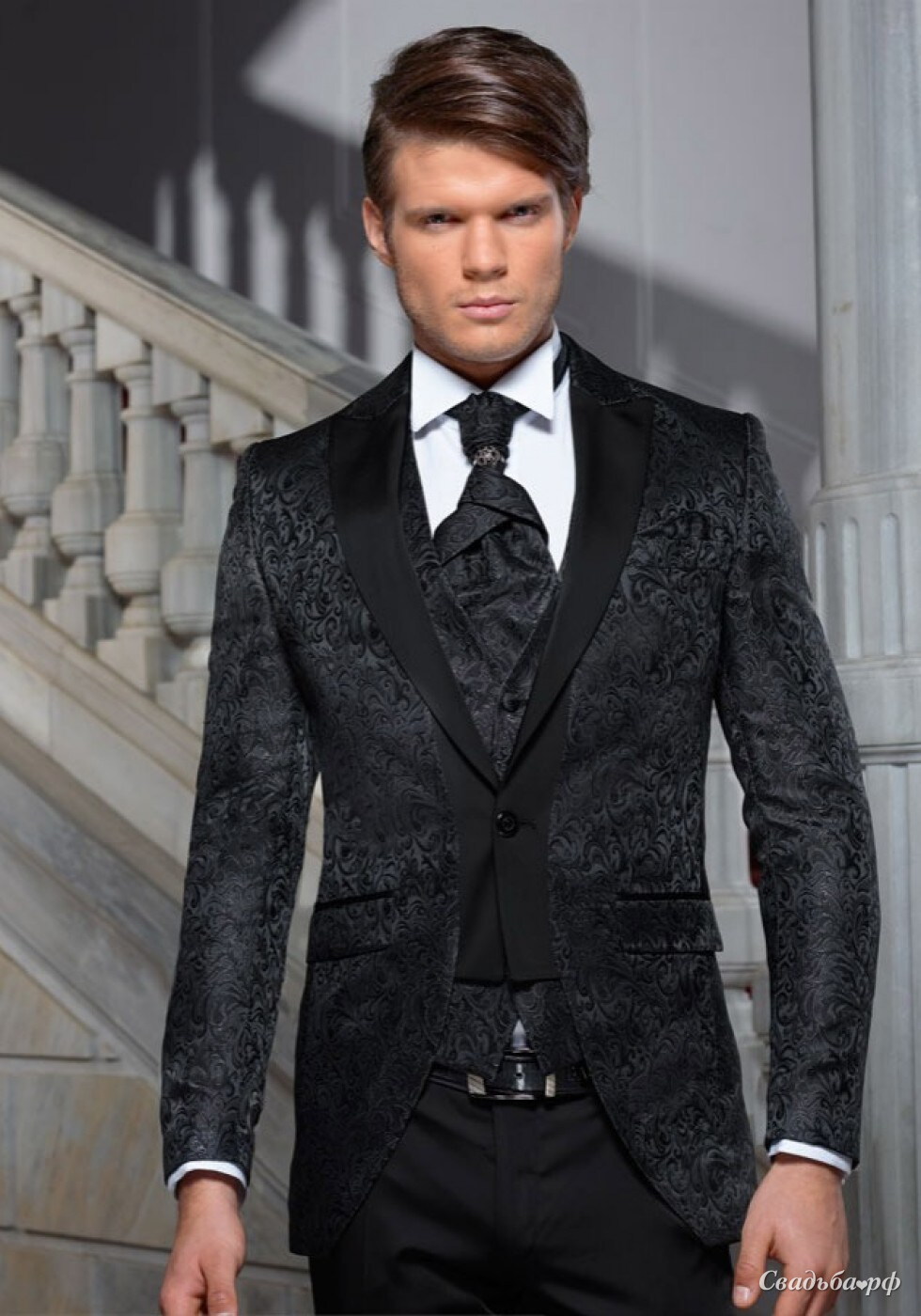 Приталенный молодежный мужской костюм, зауженные брюки. В комплект входит Пиджак, брюки, жилет, пластрон, брошка для пластрона.