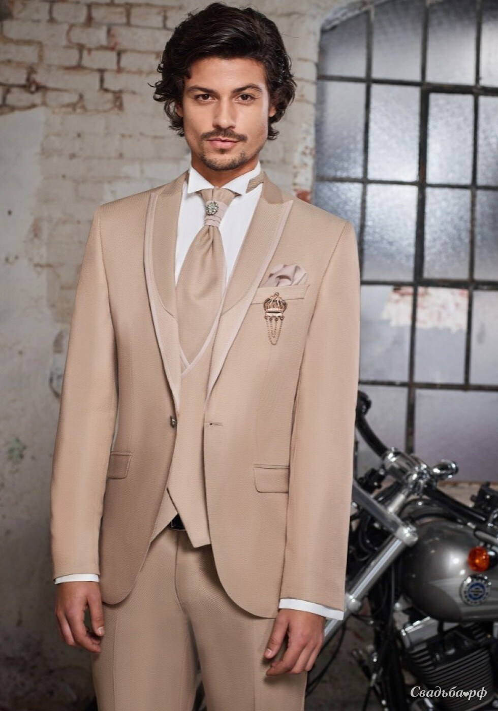 Свадебный костюм - тройка с отстегивающемся лацканом из фактурной ткани.