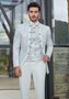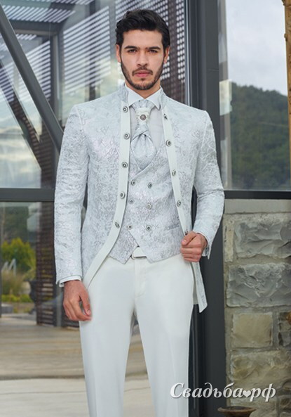 Нарядный френч из серебристой фактурной ткани. Коллекция 2020 года. В комплект входит: приталенный пиджак, зауженные брюки, жилет, пластрон.