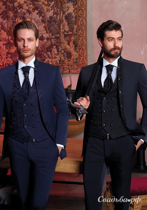 Элегантный костюм на свадьбу приталенного силуэта. Доступен в синем и черном цветах. Размерный ряд 44-64