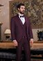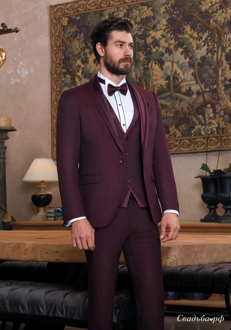 Изысканный бордовый костюм тройка для торжества. Комплект: приталенный пиджак на одну пуговицу, зауженные брюки, жилетка, бабочка, платочек в карман.