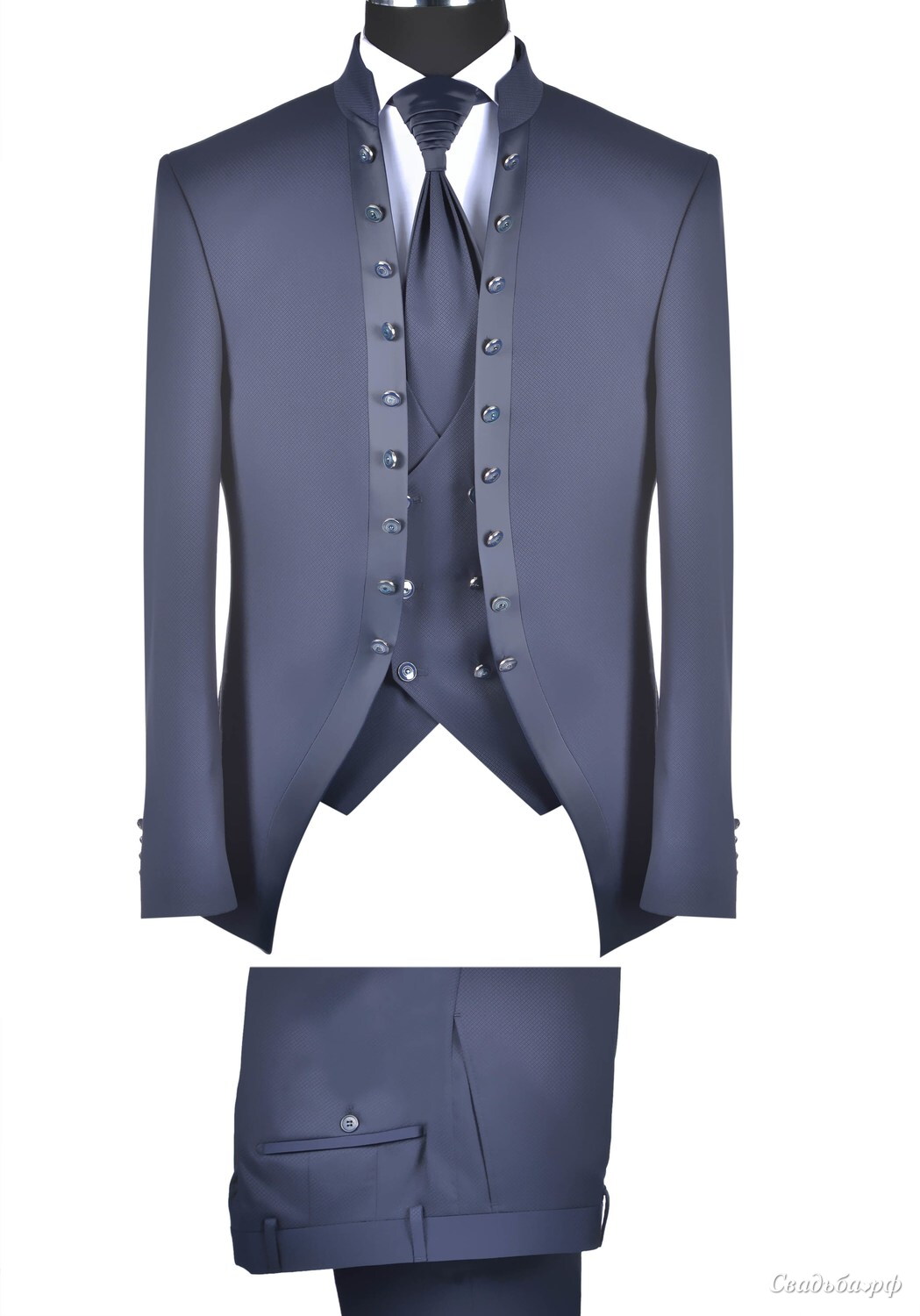 Мужской костюм с воротником стойка на свадьбу. Комплектация: приталенный пиджак, жилет двубортный, зауженные брюки, пластрон.