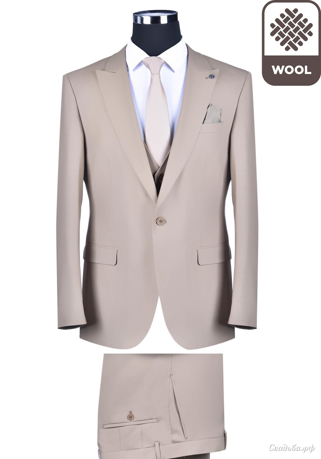 Классический костюм тройка для жениха. В комплект входит приталенный пиджак с острым лацканом, двумя шлицами; жилет на 4 пуговицах, зауженные брюки. Цвет "визон" бежевый.