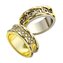 Изысканные комбинированные обручальные кольца из белого и жёлтого золота. Широкий ободок по краям украшен витой лентой другого цвета, а посередине - геометрическим орнаментом. На лицевой стороне одного кольца - несколько изумительных бриллиантов. Такие кольца отлично сочетаются с любыми другими украшениями и эффектно смотрятся на любой руке.