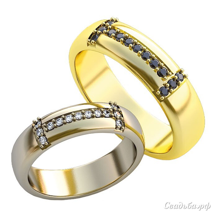Изумительные обручальные кольца из белого и жёлтого золота. Оба колечка имеют абсолютно гладкий округлый ободок с декоративной композицией на лицевой стороне. Модель из белого золота украшена бриллиантами идеальной огранки, которые завораживают своим прекрасным блеском и привлекают всеобщее внимание.