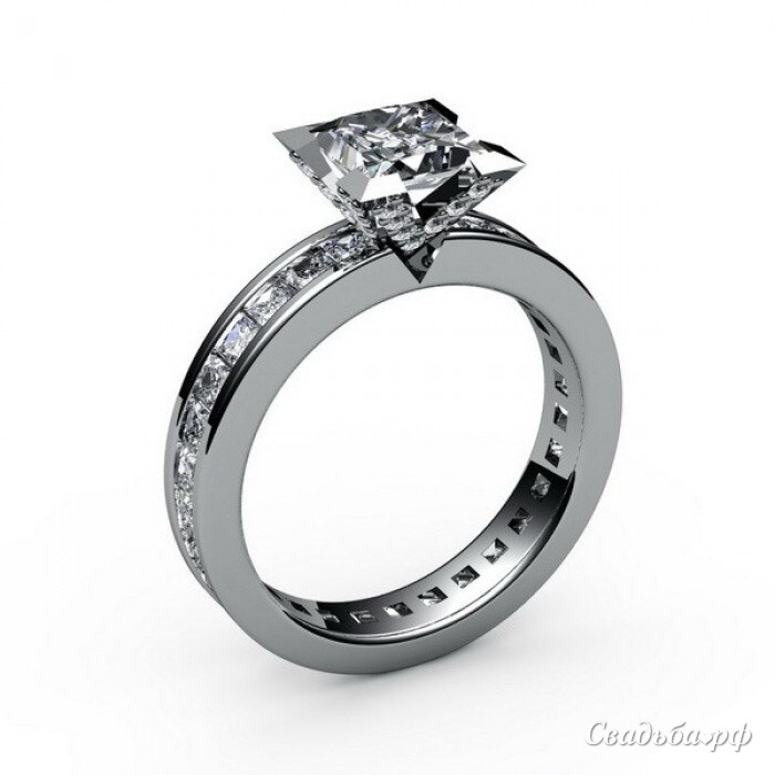 Элегантное обручальное кольцо из платины. Неширокий ободок модели инкрустирован небольшими камешками. В центре кольца находится достаточно крупный квадратный бриллиант совершенной огранки. Именно таким восхитительным колечком замужние дамы охотнее всего хвастаются перед всеми своими подружками и знакомыми.