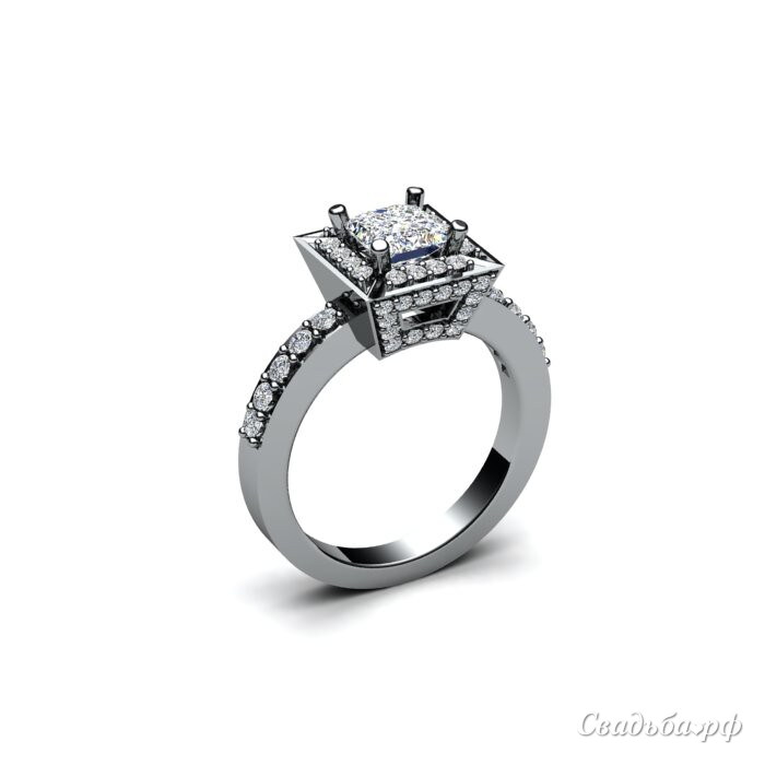 Роскошное обручальное кольцо из белого золота с бриллиантами совершенной огранки. Отличительной особенностью данной модели является наличие только строгих, геометрически правильных линий. Тонкий ободок и трапециевидное основание для большого камня инкрустированы маленькими переливающимися камешками.