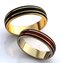 Очень необычные строгие обручальные кольца из белого и жёлтого золота. Наружная сторона модели оформлена решёткой красного или чёрного цвета. Тонкие блестящие полоски пересекают эту решётку чёткими горизонтальными линиями. Кольца выглядят очень элегантно и даже изысканно. Особенно тогда, когда пара нежно держит друг друга за руку.