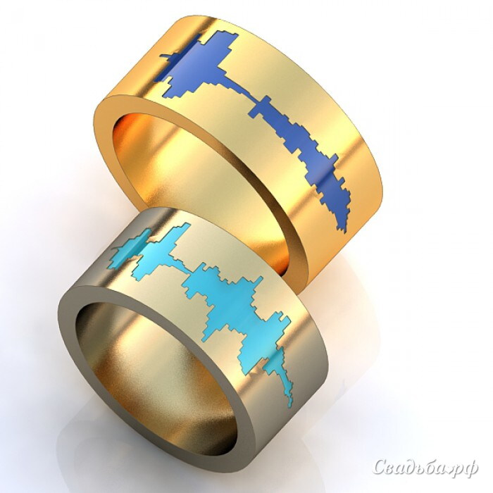 Оригинальные обручальные кольца из белого и жёлтого золота для смелой влюблённой пары. Широкий ободок модели надёжно держится на пальце, не переворачивается и не спадает. Его лицевая сторона украшена абстрактным рисунком (синего или ярко-голубого цвета), чем-то напоминающим ритм сердцебиения. Возможно, именно так и стучит влюблённое сердце!