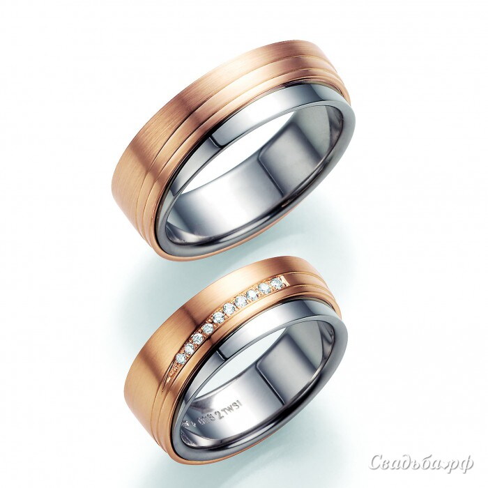 Великолепные парные обручальные кольца из комбинированного золота. Одинаковые по своему дизайну они различаются лишь рядом небольших изящных бриллиантов, расположенных по центру ободка кольца невесты. Уникальная выпуклая форма по внутренней поверхности обеспечивает комфорт при ношении. Этот комплект станет символом долгого и крепкого союза.
