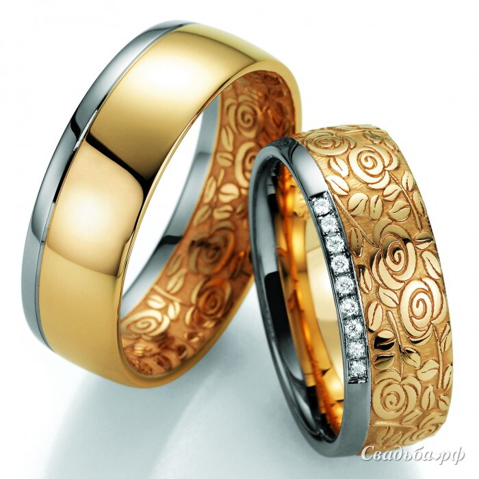 Обручальные кольца из комбинированного золота с оригинальным дизайном. Массивный обод из желтого золота оформлен по краю отполированной платиновой полосой. Сдержанность дизайна кольца, украшенного по внутренней поверхности, подчеркивает мужской характер изделия. Вариант для нее украшает цветочный принт рельефного рисунка и лента эффектных бриллиантов.