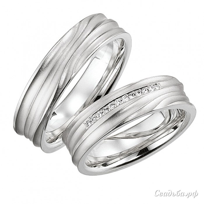 Изысканный комплект обручальных колец из белого золота. Уникальность дизайну придают глубокие рельефные линии по всей поверхности украшений. Лента из нескольких бриллиантов украшает изделие для нее, повторяя изгиб изящной линии. Дуэт этих колец станет подтверждением великолепного союза и изысканного вкуса своих обладателей.