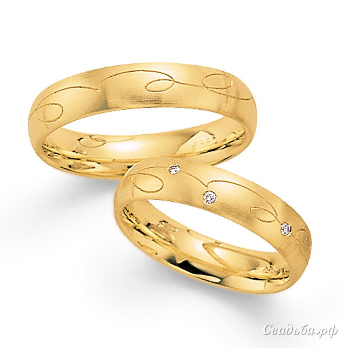 Роскошные обручальные кольца из желтого золота демонстрируют изысканность и преданность аристократизму. Изящный декор в виде непрерывной графической линии с завитками сопровождает всю поверхность изделий. Три сияющих бриллианта, погруженные в объятия благородного металла ярко желтого цвета завершают великолепную композицию на кольце для нее.