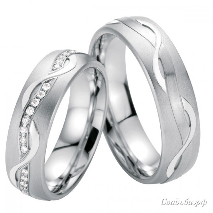 Изумительные парные обручальные кольца из белого золота. Рельефная полоса, выступающая на матовой поверхности изделий, переплетается с извивающейся лентой из белого металла, а в женском исполнении декорирована дорожкой из ярких бриллиантов. Глянцевая полоса белого золота по краю ободка нарушает матовость внутренней поверхности изделий.