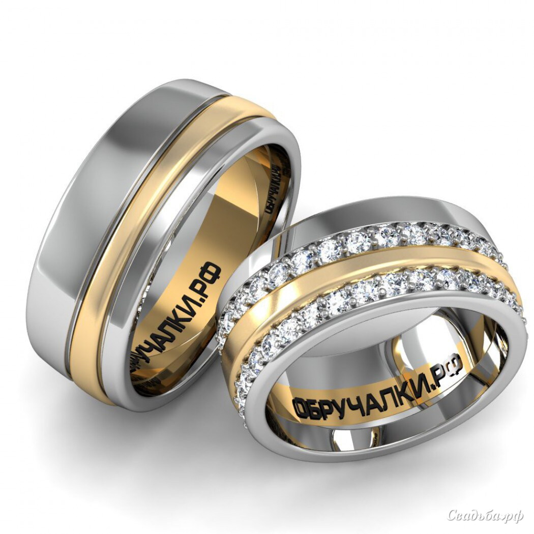 Широкие обручальные кольца из белого золота дополнены вставкой из желтого драгоценного металла. Женское колечко в этой паре декорировано двумя дорожками чистейших бриллиантов. Ширина колец от 8 до 15 мм.