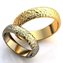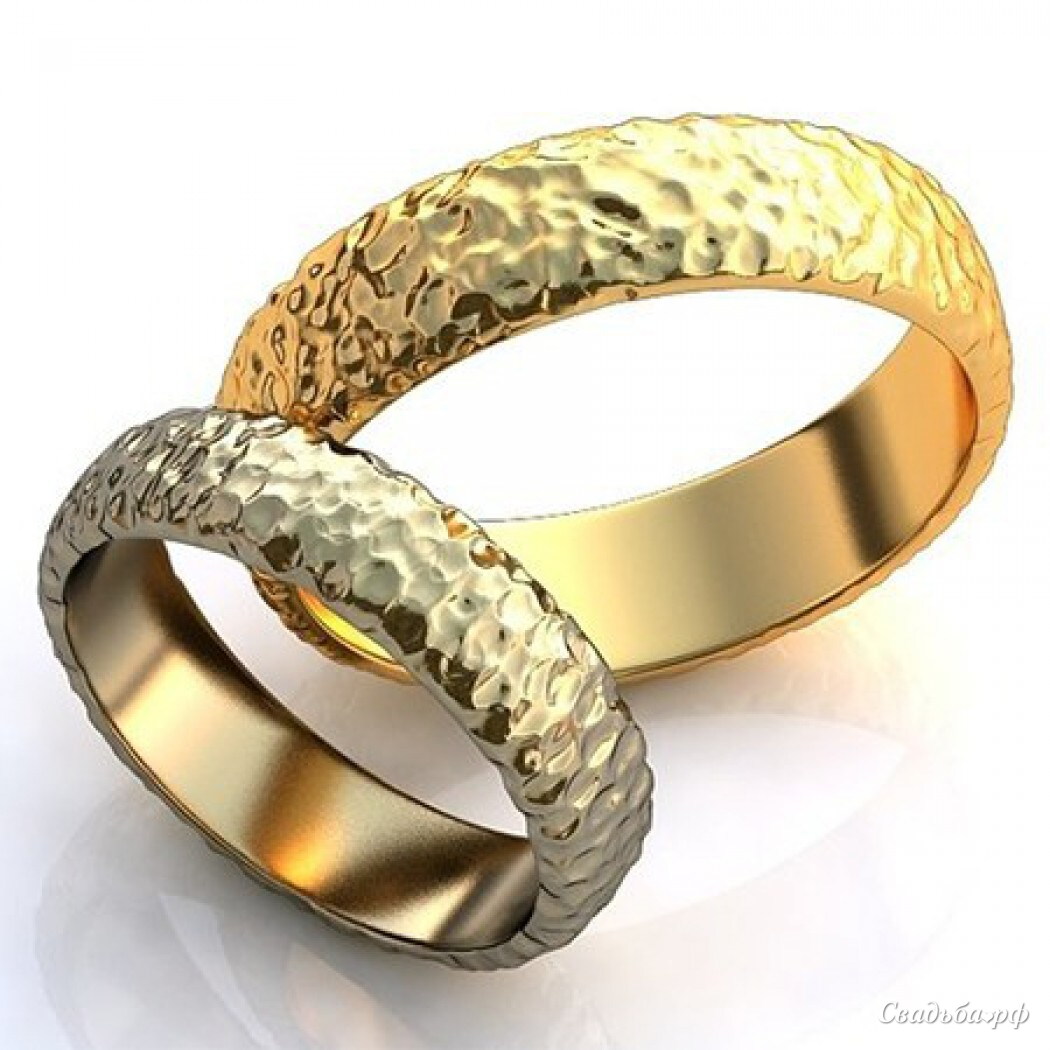 Парные обручальные колечки с рельефной поверхностью. Одно кольцо выполнено из белого золота, второе – из жёлтого драгоценного металла. Ширина колец от 6 до 10 мм.
