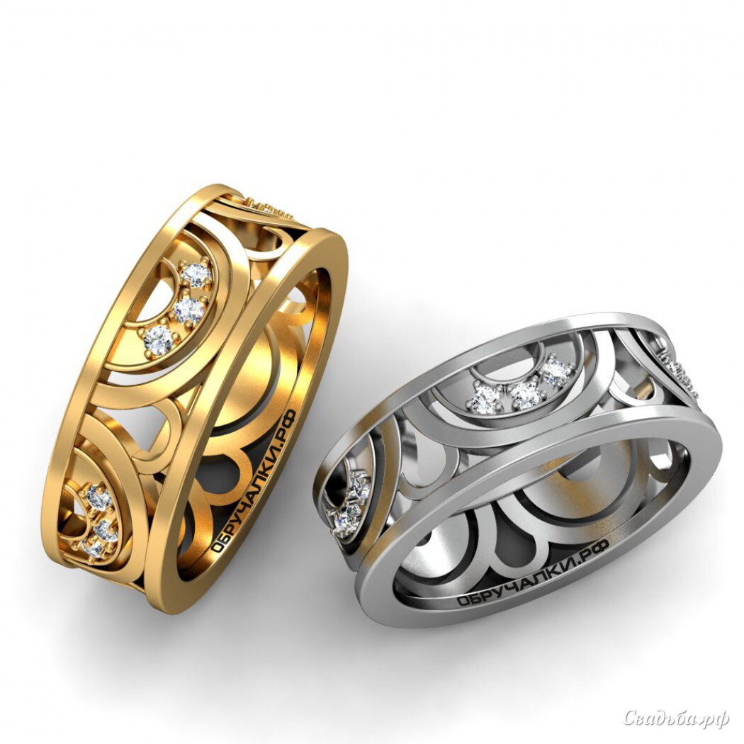 Два оригинальных обручальных кольца: одно выполнено из белого золота, второе – из классического жёлтого металла. Широкие ободки изделий напоминают тонкое кружево со сверкающими бриллиантами.