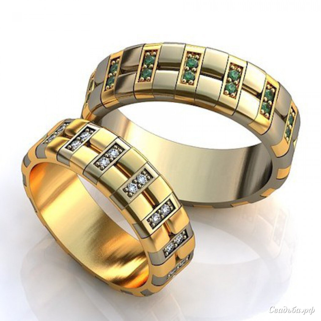 Парные обручальные кольца из комбинированного драгоценного металла. Изделия визуально разделены на два тоненьких колечка, скреплённых между собой поперечными перемычками с бриллиантами и изумрудами.