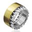 Необычное обручальное кольцо из белого и желтого золота. Представленная модель состоит из двух частей: классическое гладкое кольцо и вставка - шестерёнка. Эти детали собираются в одно целое кольцо с внутренней частью из белого золота и внешней из золота желтого цвета. Ширина ювелирного изделия от 5 до 12 мм.