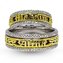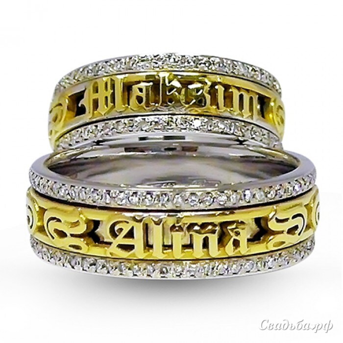 Парные обручальные кольца выполнены из белого золота и украшены двумя дорожками бриллиантов с двух сторон по всей окружности. Посередине вставка из желтого золота с именами молодоженов, выполненных в готическом стиле техникой филигрань, эта вставка может крутится.