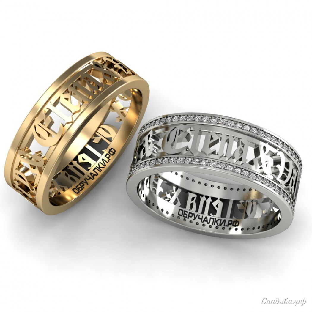 Изящные обручальные кольца для поклонников готики. Мужское кольцо из желтого золота и без камней. Женское – из белого и с двумя дорожками бриллиантов с обеих сторон от основной части, которая в женском и в мужском варианте сделана филигранью в виде имен молодоженов. Объёмные буквы исполнены в красивом готическом стиле латиницей.
