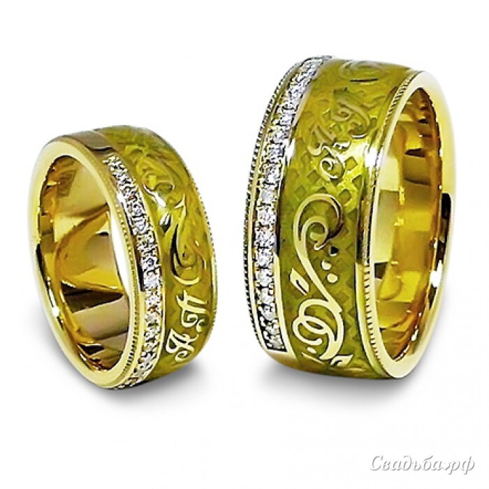 Широкие обручальные кольца из жёлтого золота покрыты эмалью и декорированы филигранью в виде орнамента растительной тематики и инициалов молодоженов. Оба изделия дополнены дорожкой из сверкающих бриллиантов и филигранью по краям.
