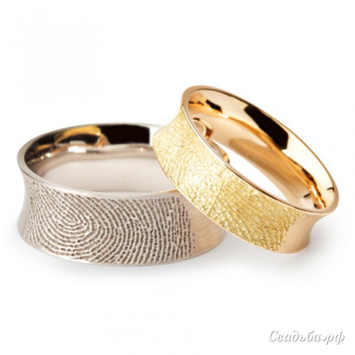Оригинальные обручальные кольца отечественного производства созданы для самых стильных и романтичных молодожёнов. Широкие ободки представленных ювелирных изделий вогнутой формы и декорированы отпечатками пальцев своих обладателей. Эти уникальные узоры не повторяются и придают сверкающим колечках особый шик и очарование.