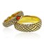 Эффектные обручальные кольца из жёлтого золота с узором под змеиную кожу. Колечко для Неё декорировано гранатом, по форме напоминающим змеиный глаз. Как известно, змея, кусающая себя за хвост, т.е. кольцо Ороборо, — это символ вечности. Эти обручальные кольца станут символом вечной любви и долгой семейной жизни.