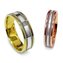 Эти обручальные кольца выполнены из комбинированного золота. В представленной паре мужское кольцо сделано из желтого золота, а по центру с внешней стороны проходит ободок из белого золота, с двух сторон от этого гладкого ободка декор филигранью в виде тонкого плетения по всей окружности. Женское кольцо выполнено в том же дизайне, но из красного золота с вставкой из белого. Ширина колец до 15 мм.