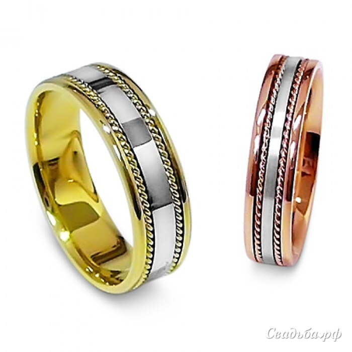 Эти обручальные кольца выполнены из комбинированного золота. В представленной паре мужское кольцо сделано из желтого золота, а по центру с внешней стороны проходит ободок из белого золота, с двух сторон от этого гладкого ободка декор филигранью в виде тонкого плетения по всей окружности. Женское кольцо выполнено в том же дизайне, но из красного золота с вставкой из белого. Ширина колец до 15 мм.