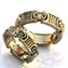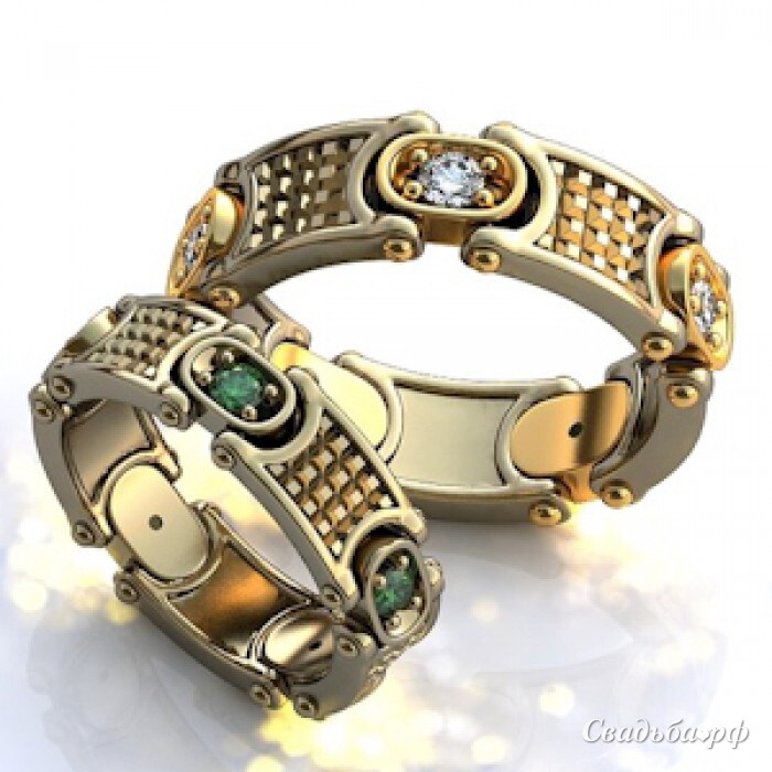Эффектные обручальные кольца со вставками бриллиантов и изумрудов. Искусно выполненные ободки декорированы объёмным узором. Одно кольцо сделано из белого золото, второе – комбинированное.