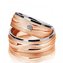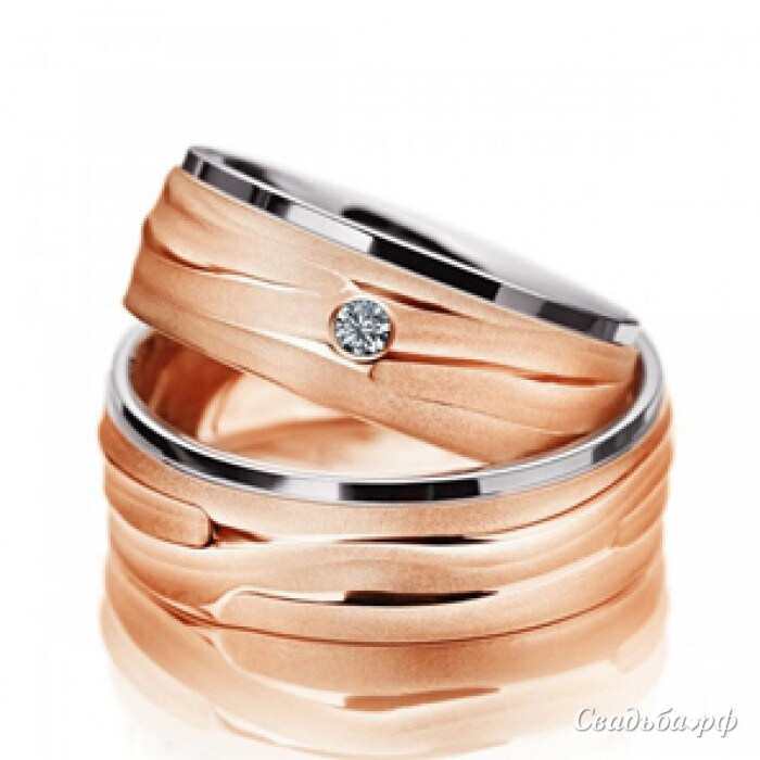 Рельефные обручальные кольца поражают плавностью форм. Сочетание матовой и глянцевой поверхности – изюминка колец. Изделия выполнены из красного золота и дополнены вставкой из белого металла.