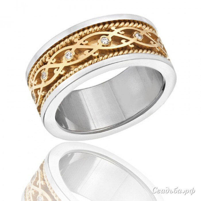 Комбинированное обручальное колечко из белого золота декорировано тончайшим плетением из жёлтого металла. Изделие дополнено сверкающими бриллиантами.