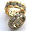 Обручальные колечки в виде миниатюрных браслетов от часов – стильно и оригинально. Одно кольцо выполнено из белого золота, второе – из нескольких видов драгоценного металла с бриллиантами.