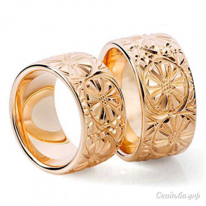 Массивные обручальные кольца с широкими ободками из розового золота. Кольца декорированы тонким орнаментом. По желанию покупателей изделия могут быть сделаны из разных видов драгоценного металла.