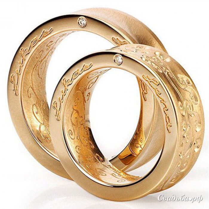 Необычные обручальные кольца с широкими ободками из розового золота. Бриллианты расположены на боковой грани колечек. Изделия можно дополнить тонкой гравировкой и узорами.