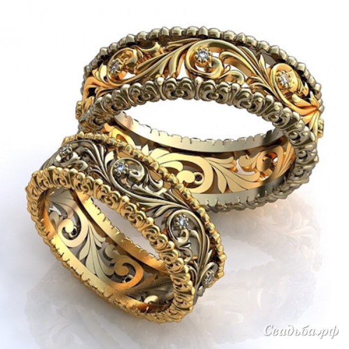 Роскошные обручальные кольца с искусно выполненным объёмным орнаментом по ободку. Изделия выполнены из нескольких видов высококачественного золота. Колечки декорированы бриллиантами.