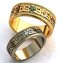 Одно обручальное колечко выполнено из белого золота, второе – из жёлтого. Оба изделия декорированы сверкающими камнями: изумрудом на варианте из желтого металла и бриллиантом на белом кольце. Тончайший орнамент техникой филигрань по всему ободку придаёт кольцам романтичность.