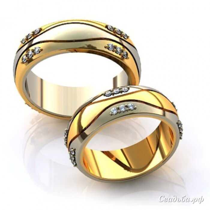Сверкающие обручальные кольца эффектно сочетают в себе белое и жёлтое золото. Плавная линия на ободке придаёт изделиям особую нежность. Кольца декорированы чистейшими бриллиантами. Возможно исполнение мужского кольца без камней.