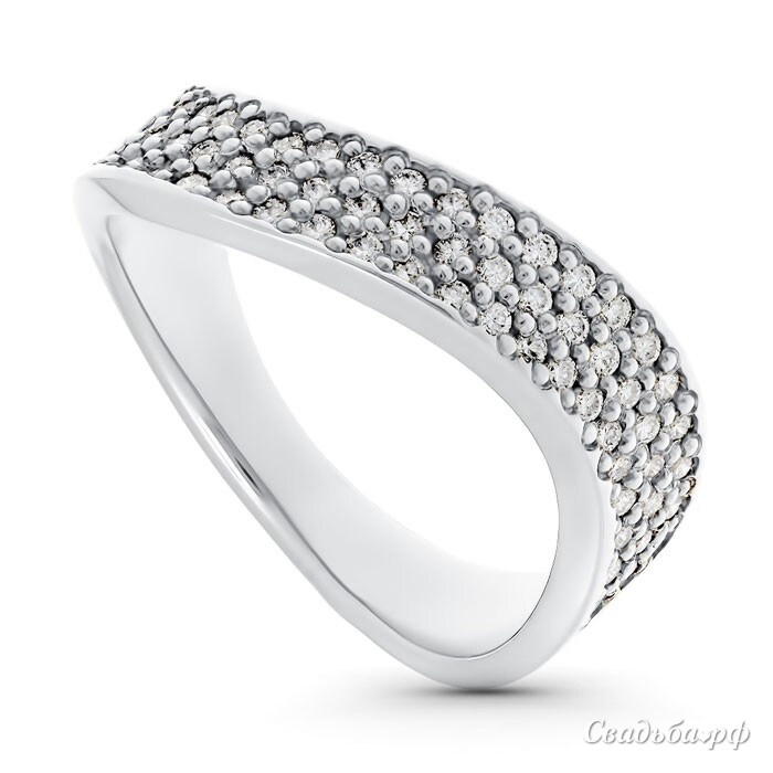Кто сказал, что кольцо обязательно должно быть круглым? Представленная модель отечественного производства ломает все стереотипы! Широкий ободок из белого золота имеет вытянутую форму капли. Кольцо усыпано миниатюрными бусинами из золота и чистейшими бриллиантами в тончайшей оправе. С таким украшением Вы будете неповторимы!