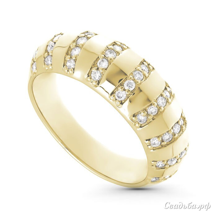 Оригинальное колечко с выпуклым ободком из благородного жёлтого золота буквально ослепляет своим блеском. Обручальное кольцо дополнено поперечными желобками, в каждом из которых расположились чистейшие бриллианты. Роскошная и бесконечно стильная модель отечественного производства станет ярким штрихом любого Вашего образа.