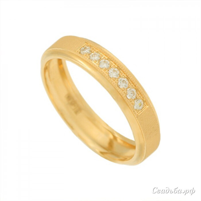 Роскошное обручальное кольцо из жёлтого золота с бриллиантами поражает своей изысканностью и утончённостью. Передняя поверхность кольца украшена ручейком из семи бриллиантов, которые станут прекрасным талисманов новой семьи. Камушки очень красиво отражают свет. Стоимость украшения зависит от варианта исполнения и размера кольца.