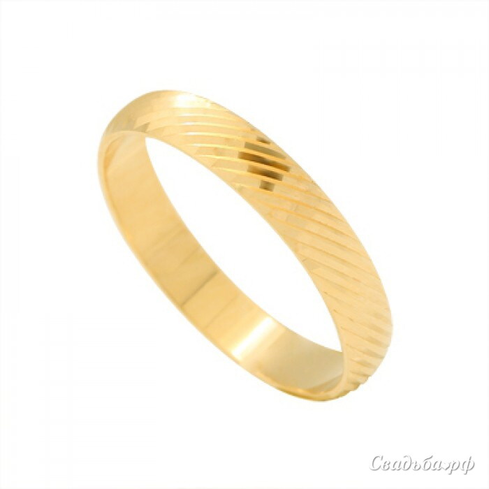 Элегантное обручальное кольцо из жёлтого золота. Поверхность кольца украшена идеально ровными диагональными насечками, которые при попадании света начинают сиять не менее эффектно, чем бриллиантовая россыпь. С таким украшением Вы всегда будете в центре всеобщего внимания и сможете даже без слов сообщить всем о своём новом статусе.